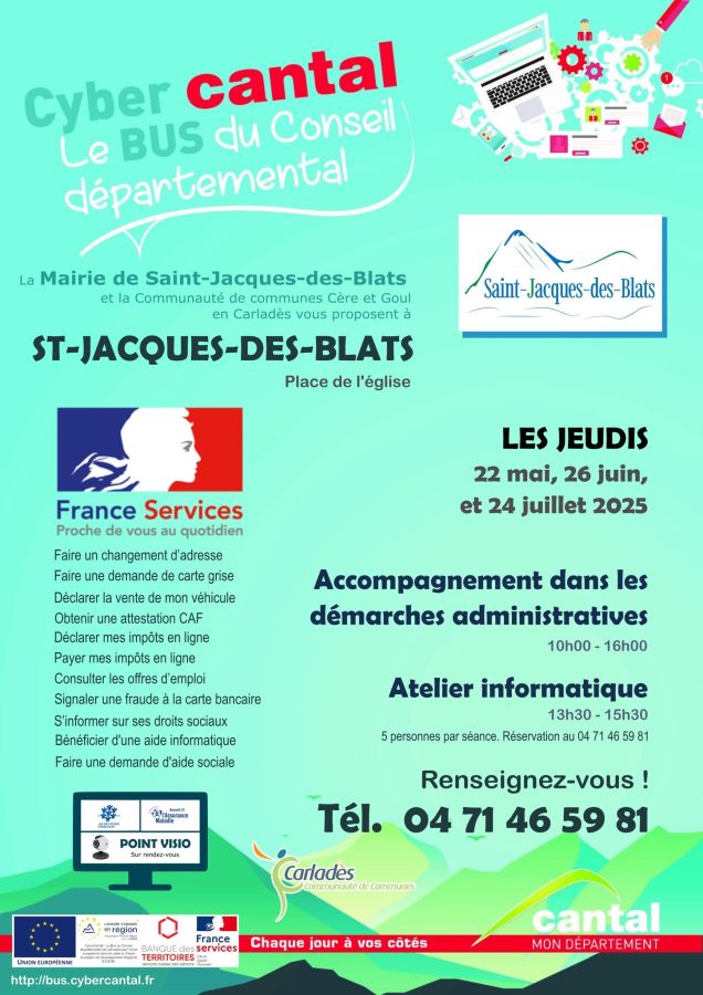 Dans la complémentarité du réseau France-Services Cantalien et en partenariat avec les Communes et les Communautés de communes, "CyberCantal - le bus" assure des permanences sur le territoire afin d'accompagner les cantaliens dans leurs démarches administratives quotidiennes et dans l’usage des différents outils numériques de 10 h à 16 h.