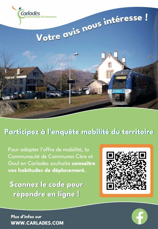 La Communauté de communes Cère et Goul en Carladès réfléchit à la manière de mieux organiser les déplacements sur le territoire et souhaite connaitre vos pratiques de mobilité et vos besoins futurs en termes de déplacements du quotidien. Vos retours nous permettront d'avoir une connaissance plus fine des besoins en mobilité sur le territoire dans l'objectif d'aboutir à des actions concrètes.