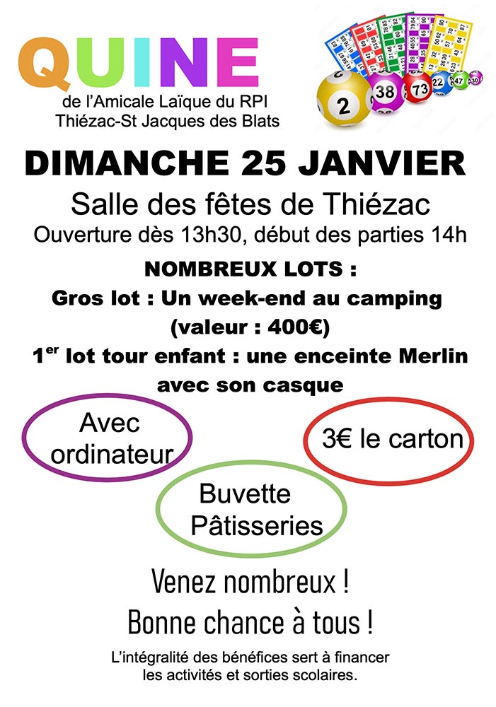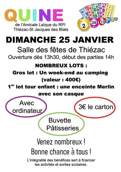 L’Amicale Laïque du RPI Thiézac – Saint-Jacques-des-Blats organise son grand quine annuel le dimanche 25 janvier, à la salle des fêtes de Thiézac. Un rendez-vous convivial et familial, ouvert à tous, pour passer un moment chaleureux tout en soutenant les activités des enfants de l’école.